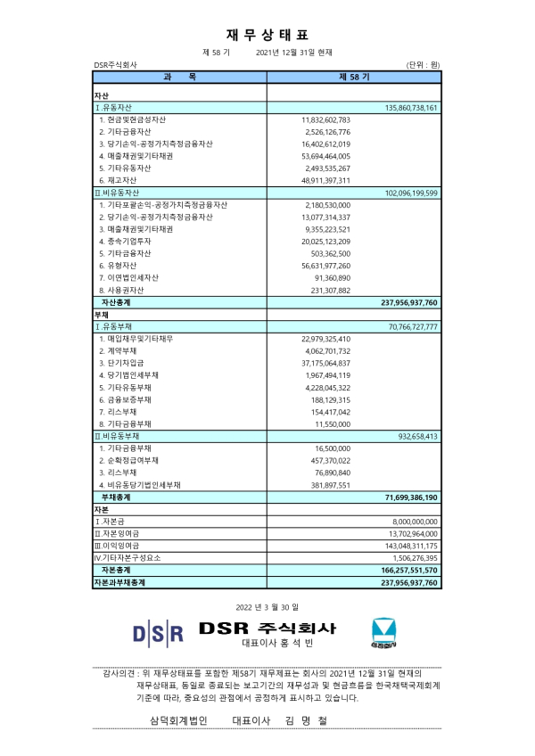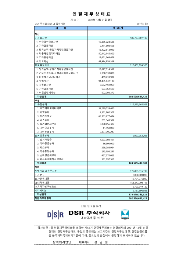 2021년 DSR(주) 연결재무상태표 및 재무상태표 2022-03-30 페이지 정보 작성자 회계팀 댓글 0건 조회 36,419회 작성일 22-03-30 11:23 목록 본문 이전글외부감사인 선임 보고 23.02.20 다음글2021년 DSR(주) 사업보고서 22.03.23