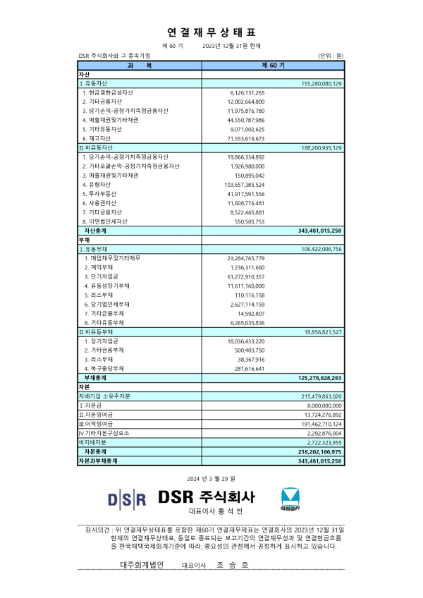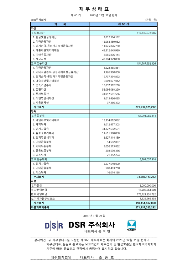2023년 DSR(주) 연결재무상태표 및 재무상태표 2024-03-29 페이지 정보 작성자 회계팀 댓글 0건 조회 28,697회 작성일 24-03-29 11:34 목록 본문 2023년 DSR(주) 연결재무상태표 및 재무상태표 입니다. 이전글2024년 DSR(주) 연결감사보고서 및 감사보고서 25.03.06 다음글2023년 DSR(주) 사업보고서 24.03.21