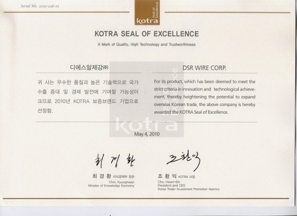 DSR제강(주)(대표 홍하종)가 지난 5월 4일에 지식경제부가 주최하고 대한무역투자진흥공사(KOTRA)가 주관하는 2010년 KOTRA 보증브랜드 사업에 선정되었습니다.